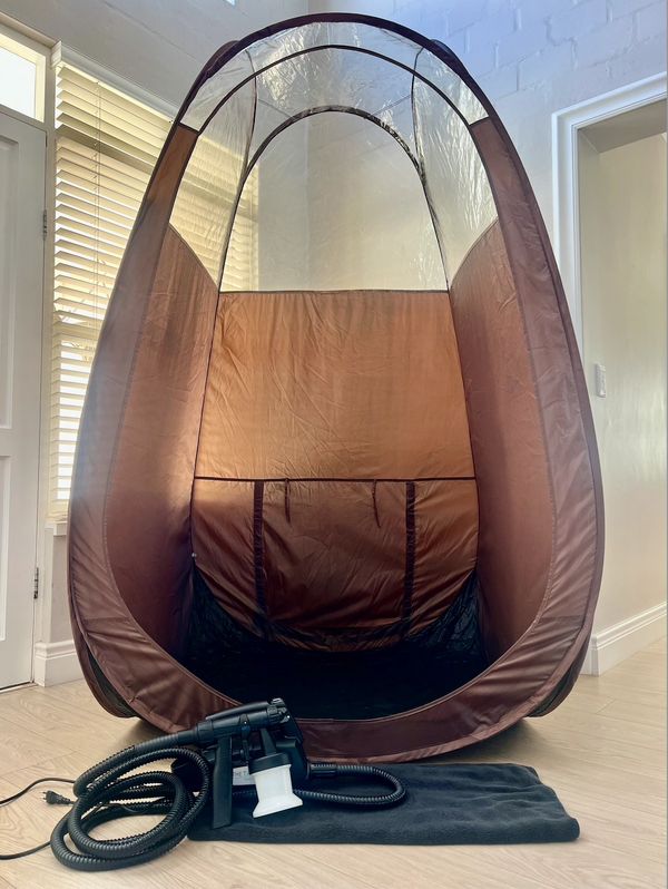 Your tan artist will bring all the necessary equipment in a compact travel system. You’ll either choose a space, or the technician will help select the ideal spot for the service. The spray tan tent is then set up in a well-lit area that’s at least 12.5 square meters in size. Access to an outlet is required, and an extension cord will be provided if needed. Your tan artist will come prepared with all the products required for pre-tan prep and the spray tan itself. Towels are laid down to protect the floor, but the spray tan process is mess-free. The tent effectively catches all residual spray, ensuring there’s zero mess left behind.